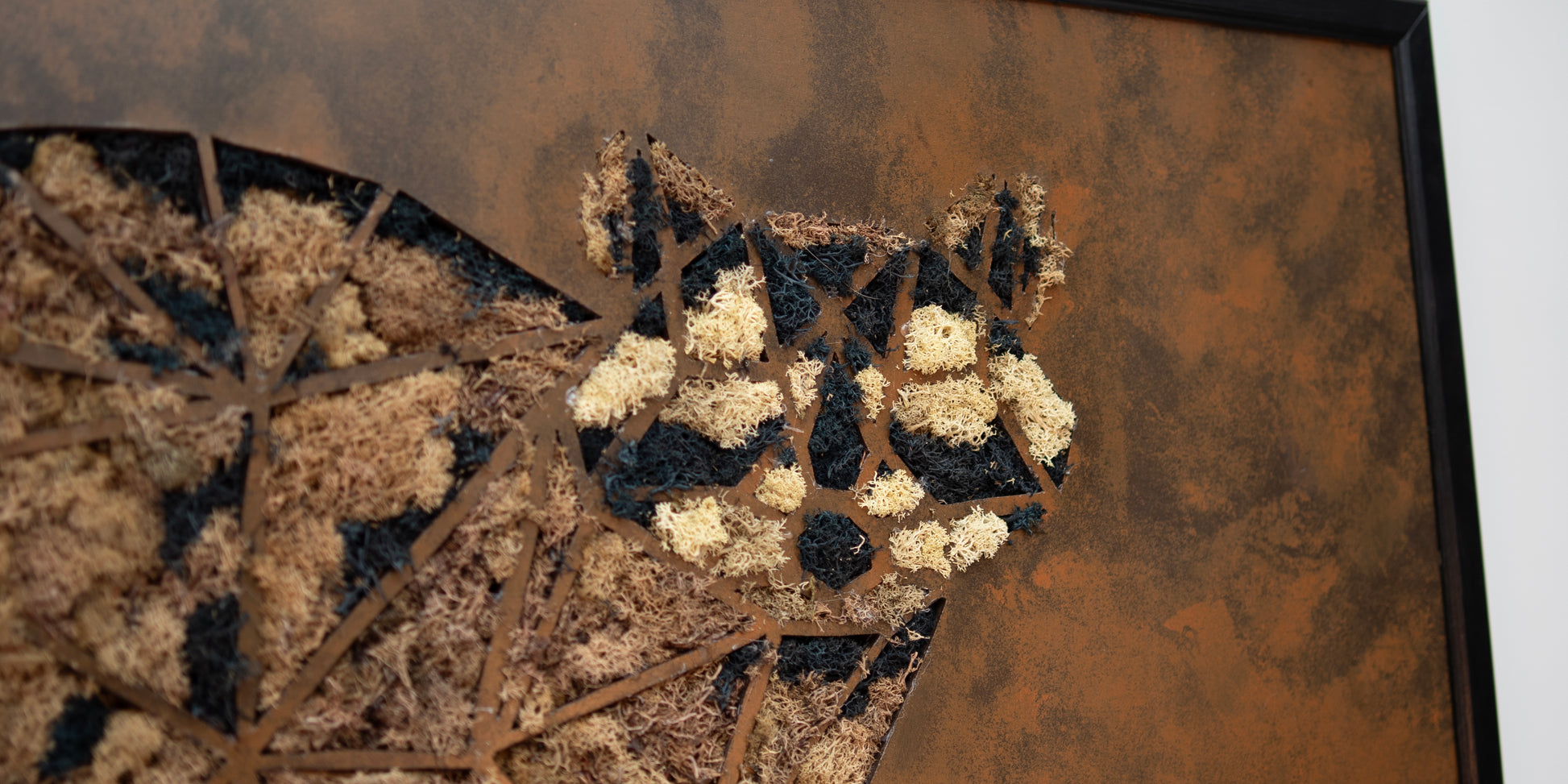 The Rustwood Raccoon blends raw earth tones with modern geometry, capturing the quiet curiosity of the wild. Crafted with preserved moss and a textured rust-finish backdrop, this piece contrasts nature’s softness with industrial warmth. Each angular line mirrors the raccoon’s iconic form — curious, grounded, and full of character. Designed to bring depth and personality to any space, it’s a modern homage to the forest’s clever wanderer.
