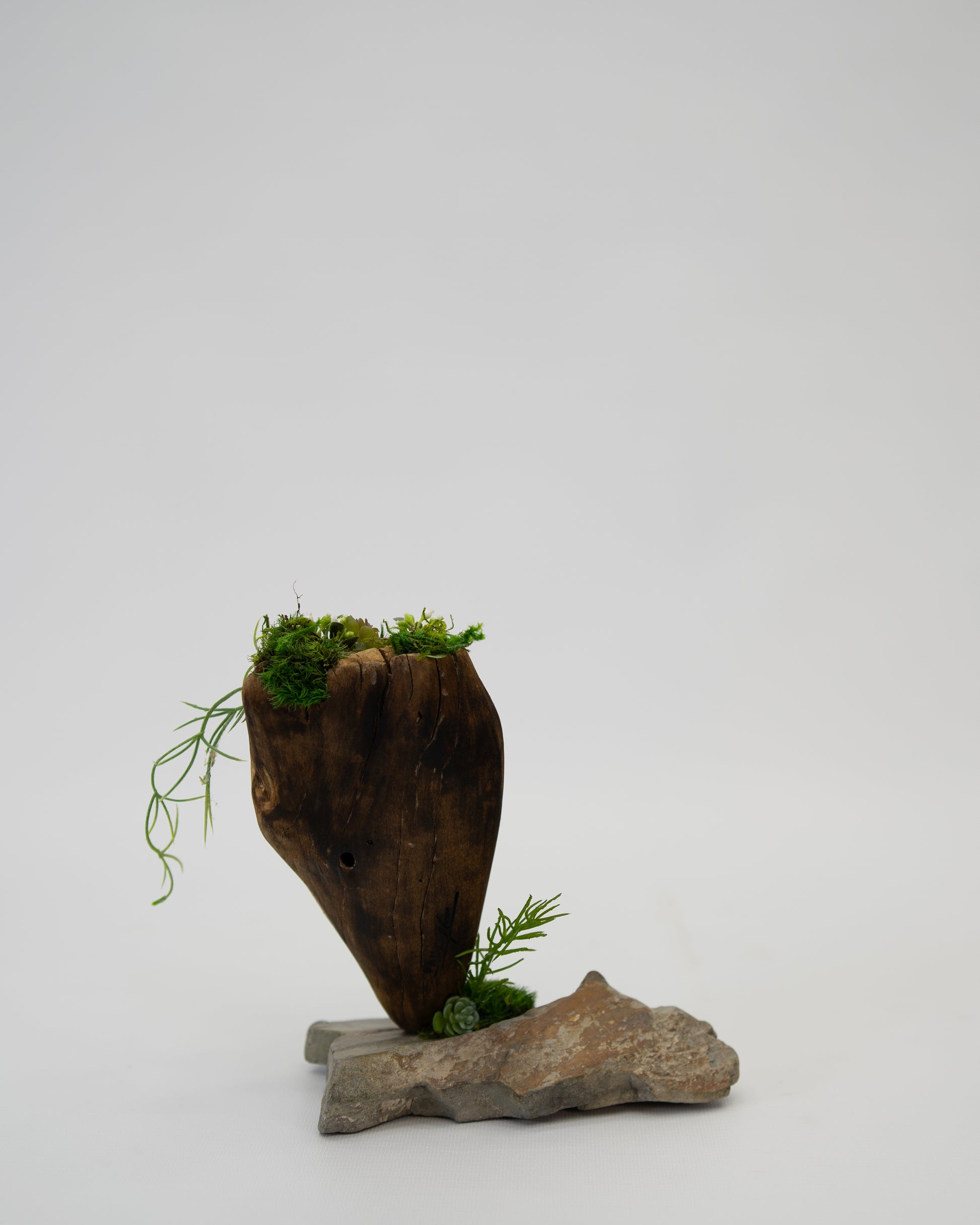 Bring the calm of the outdoors into your space with the Green Moss Drift Display. Handcrafted in the Okanagan, this unique arrangement features natural driftwood and stone, accented with lifelike artificial moss and greenery. A perfect low-maintenance centerpiece for shelves, desks, or entry tables — each piece is one-of-a-kind.