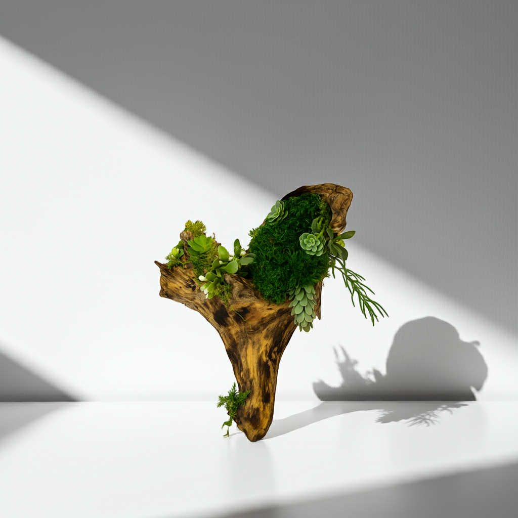 The Eden Drift is a sculptural fusion of nature and art — where driftwood’s organic form meets lush, lifelike greenery. Handcrafted with preserved moss and realistic succulents, each curve of the wood cradles a vibrant display that feels alive yet timeless.