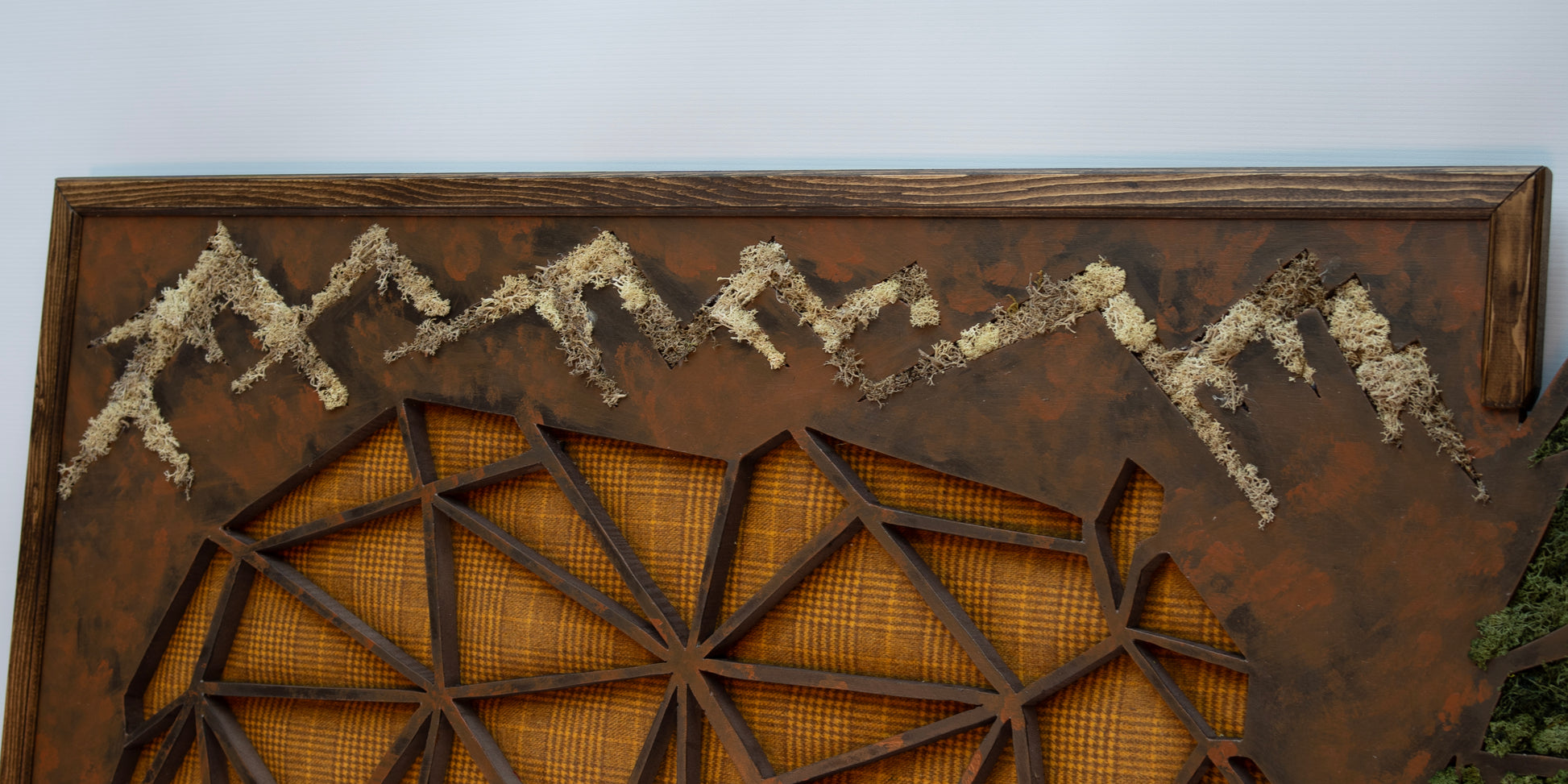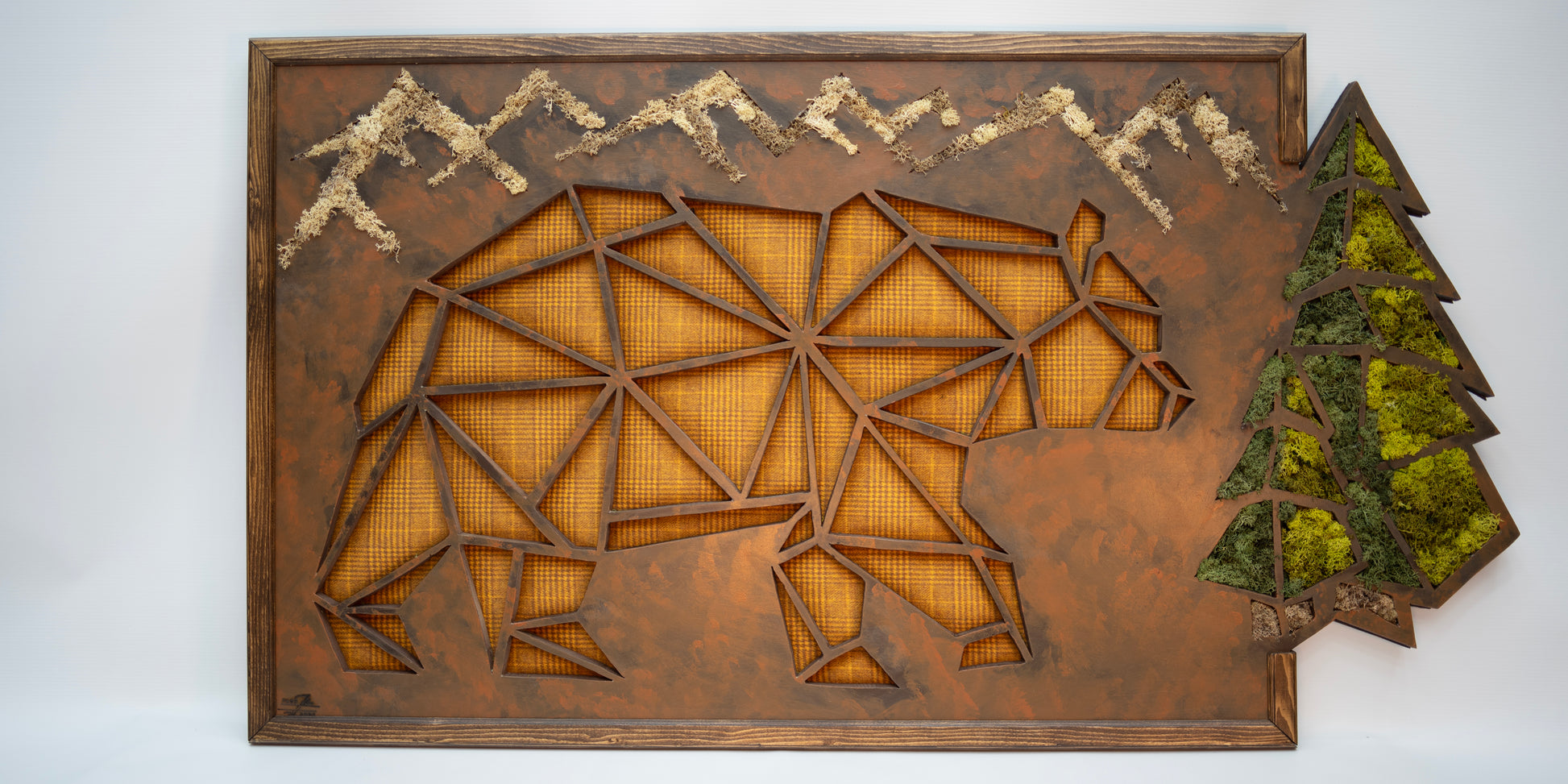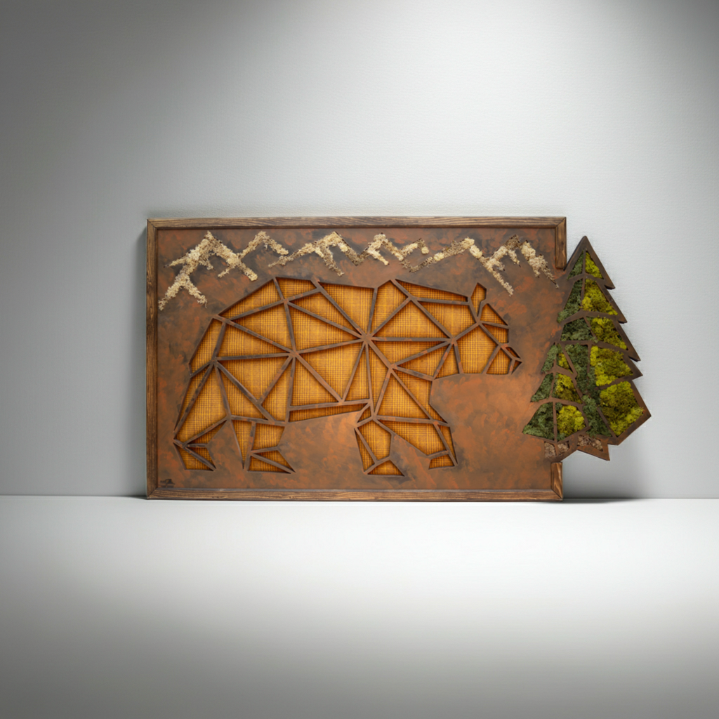 The Timberline Bear captures the spirit of the mountains — where rugged landscapes meet quiet beauty. Crafted from warm-toned driftwood textures, preserved moss, and a rusted metal finish, this piece bridges geometry and wilderness. The bear’s angular form rests beneath moss-lined peaks and a living pine, symbolizing endurance, balance, and the harmony of nature reclaimed. A statement of strength and calm, it brings the essence of the outdoors into any modern space.