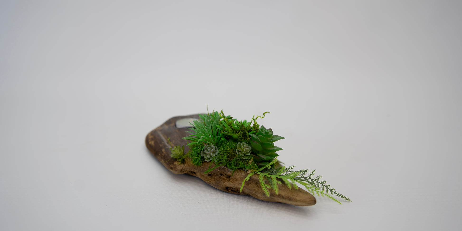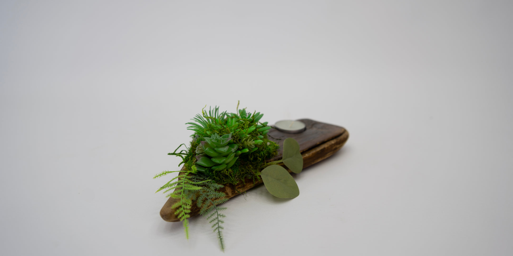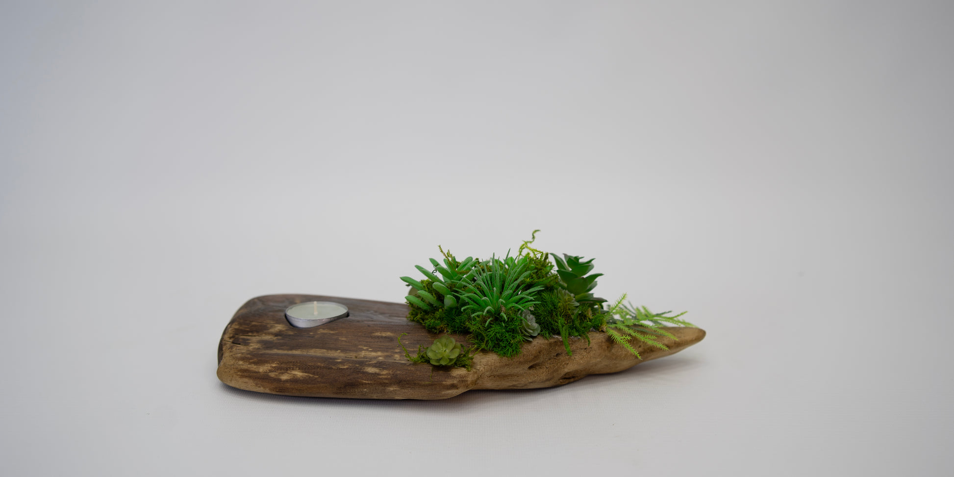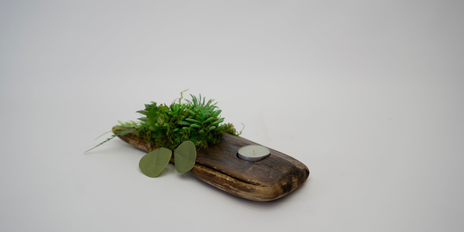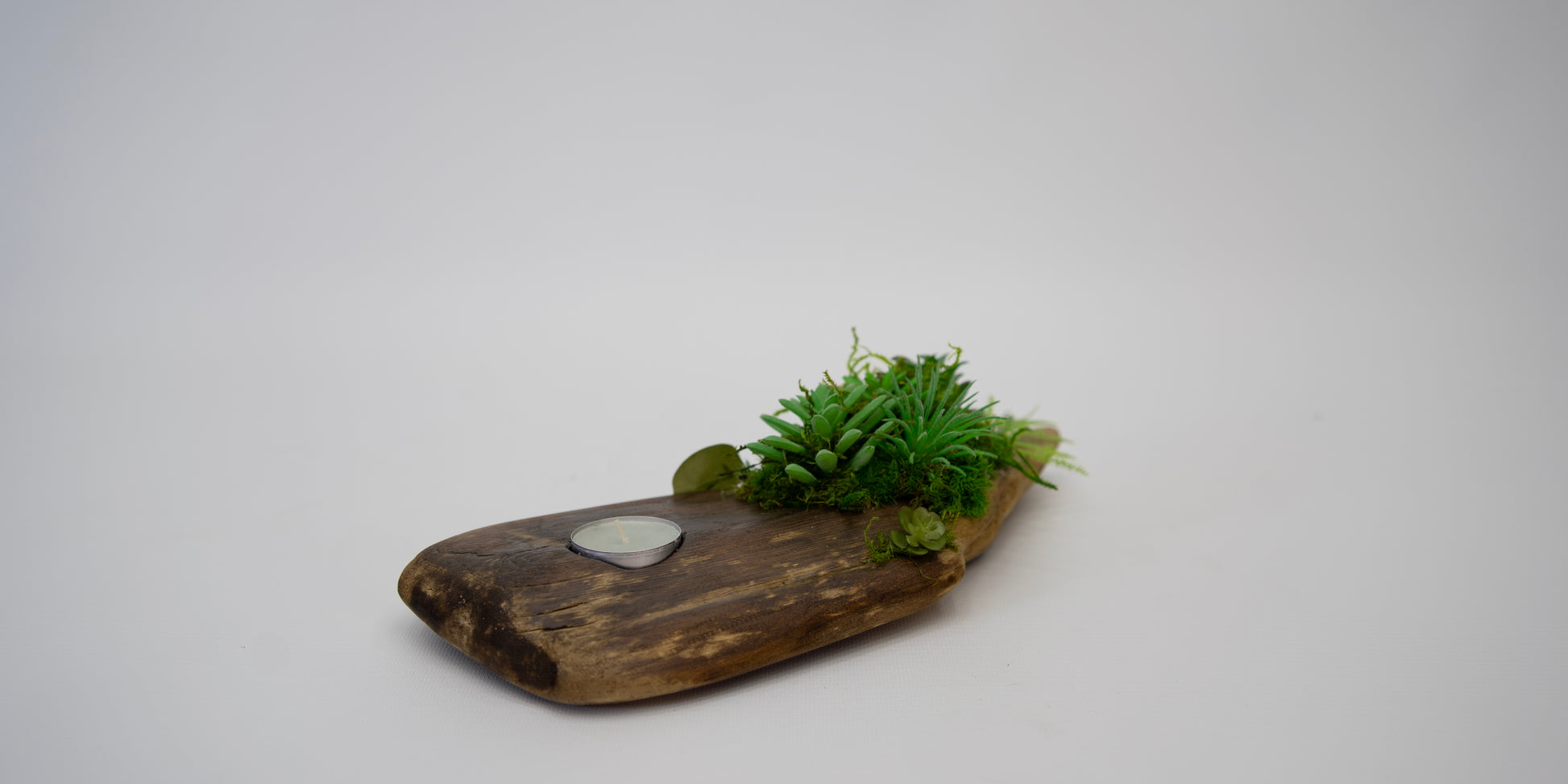 The Aura Candle Holder brings warmth and vitality into any space. Handcrafted from natural driftwood and adorned with preserved moss and lifelike succulents, it radiates organic charm in every detail. A single candle rests at its center, casting a gentle glow that enhances the wood’s natural form — a harmonious blend of light, texture, and tranquility.