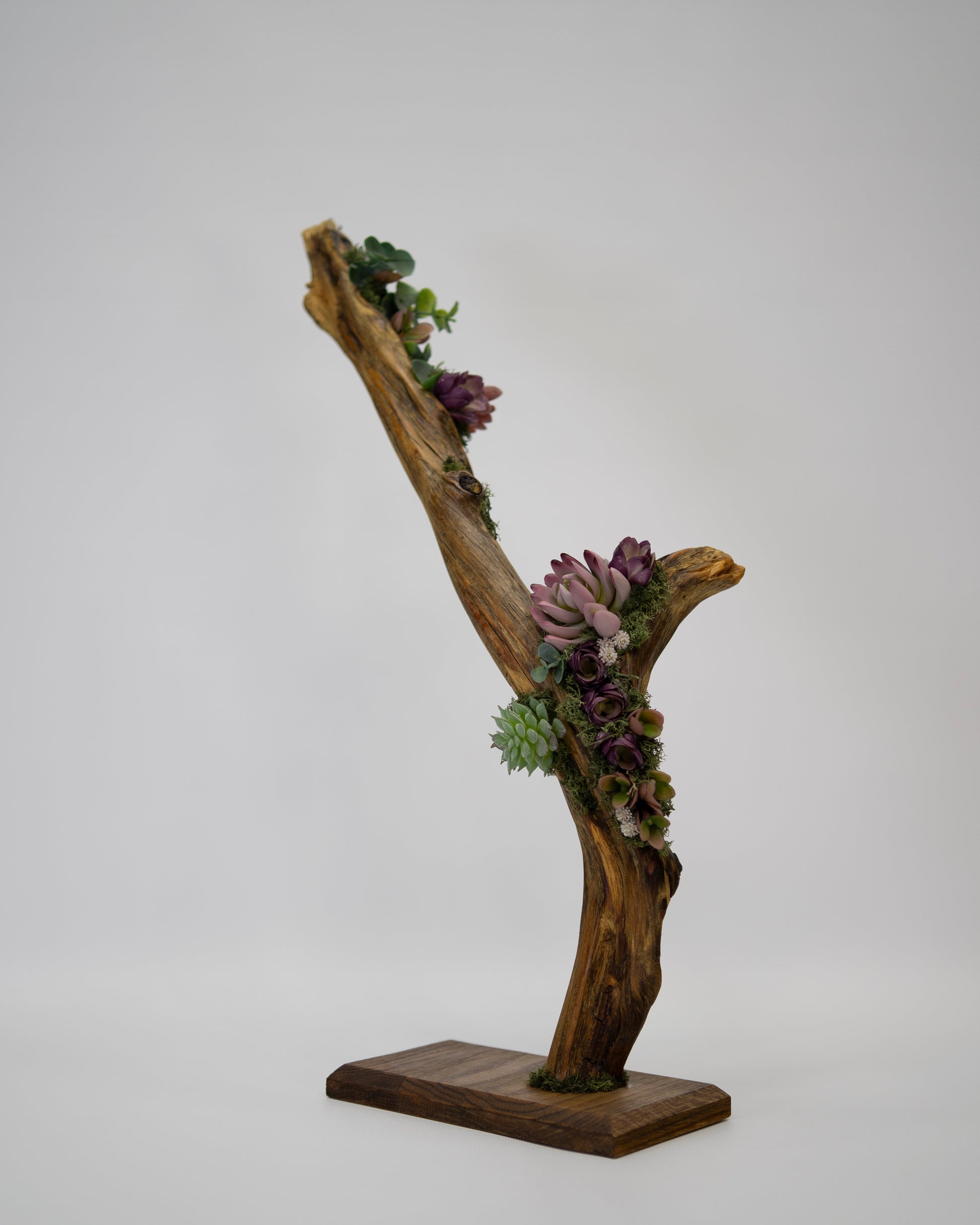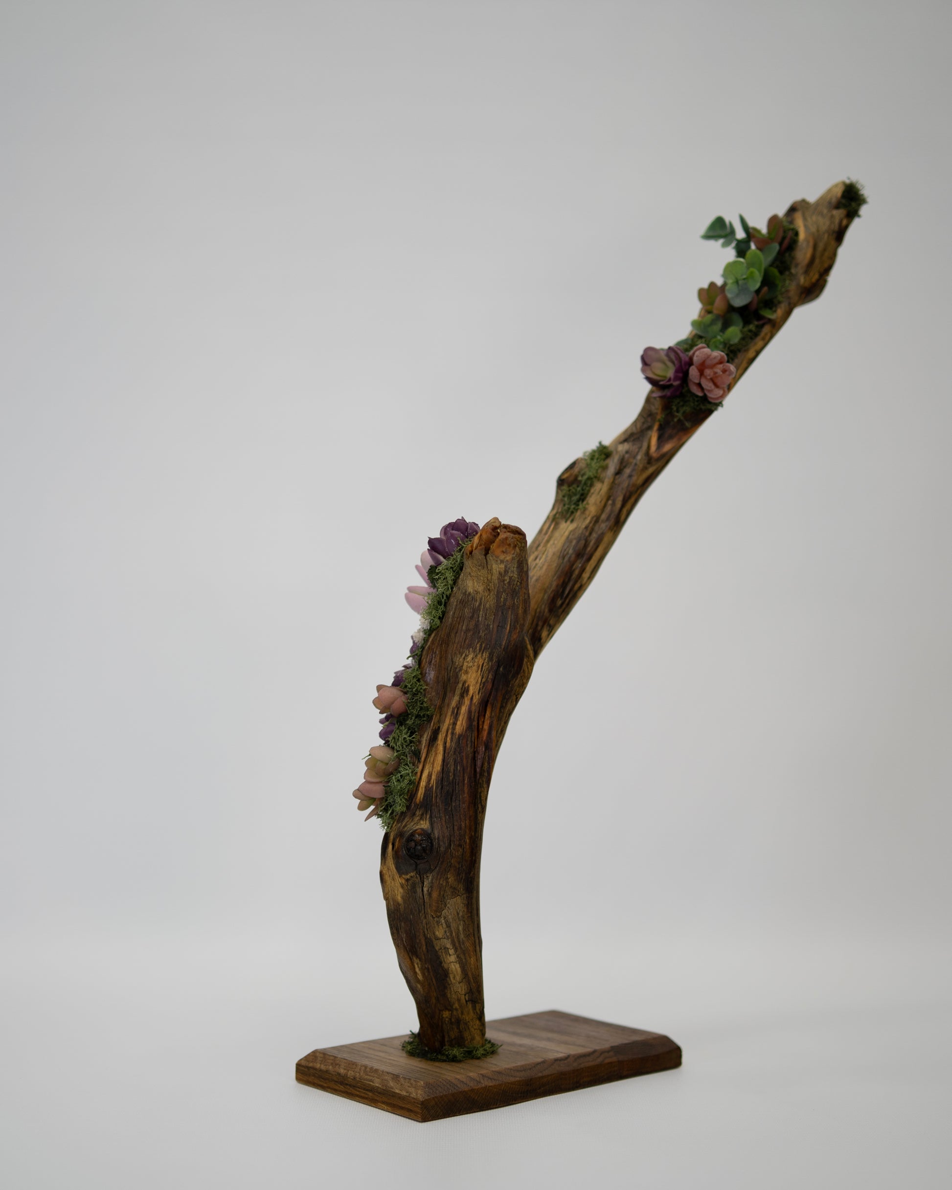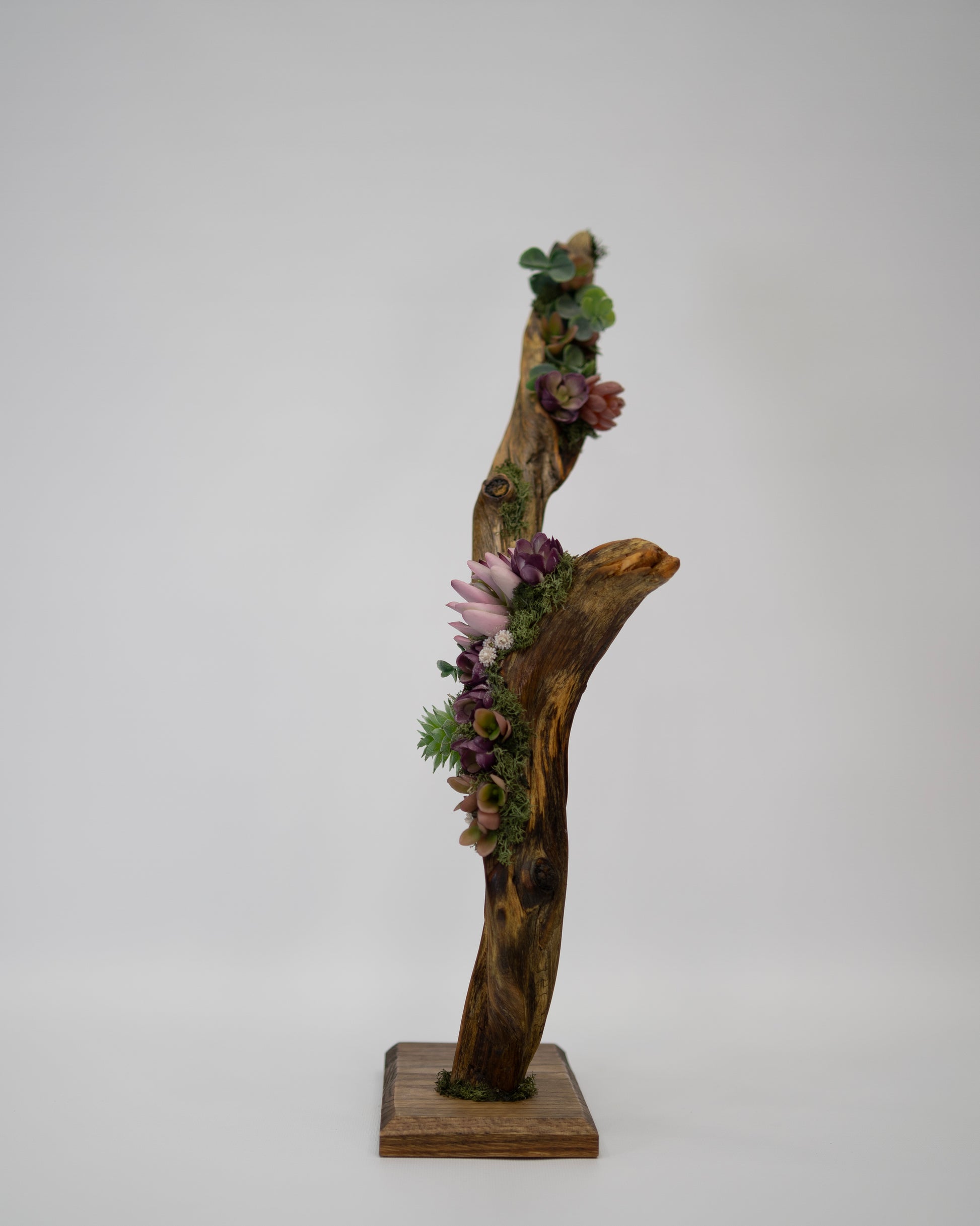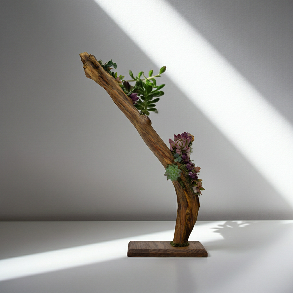 Elevate blends natural driftwood with realistic faux succulents and moss, designed to draw the eye upward and add effortless character to modern spaces.