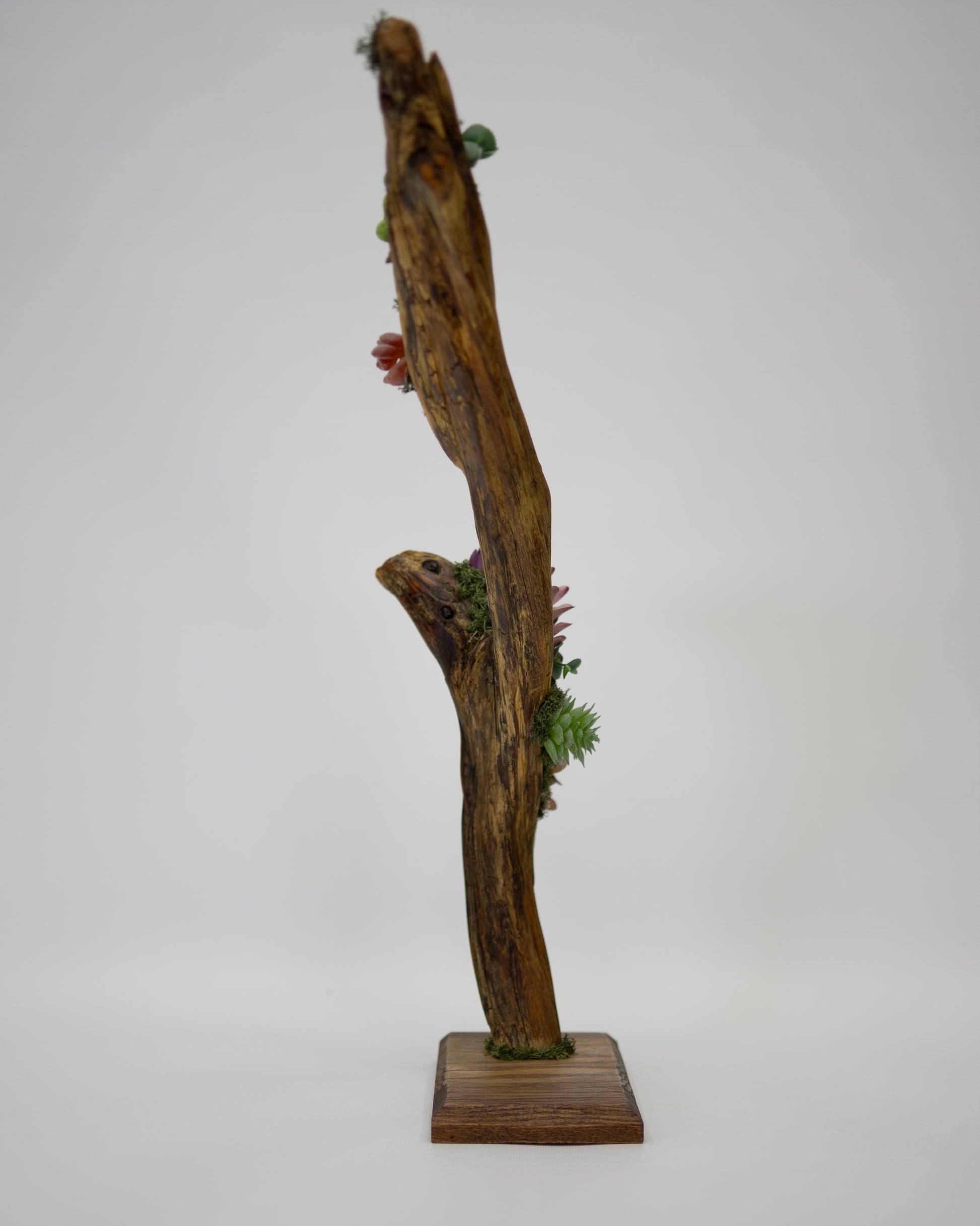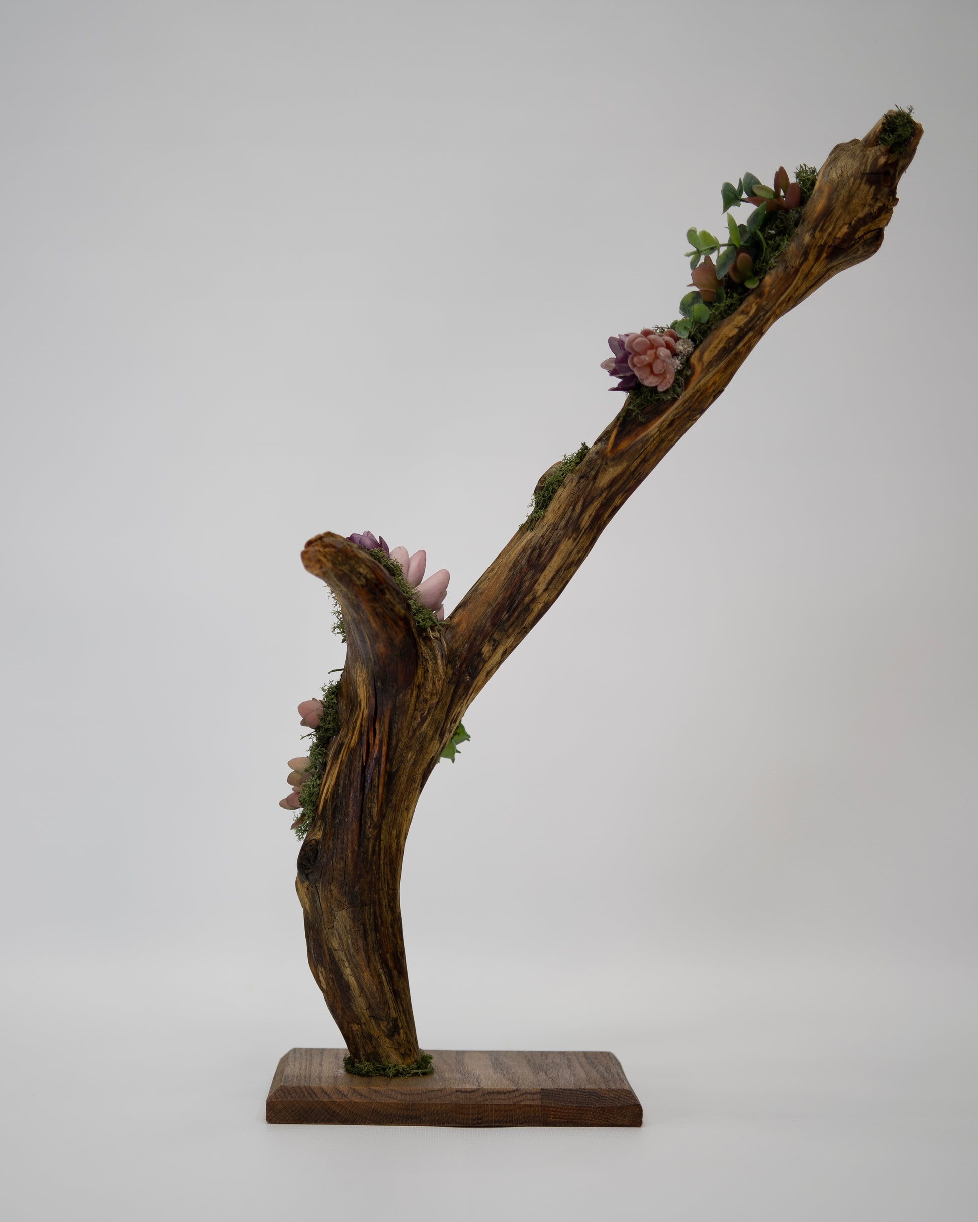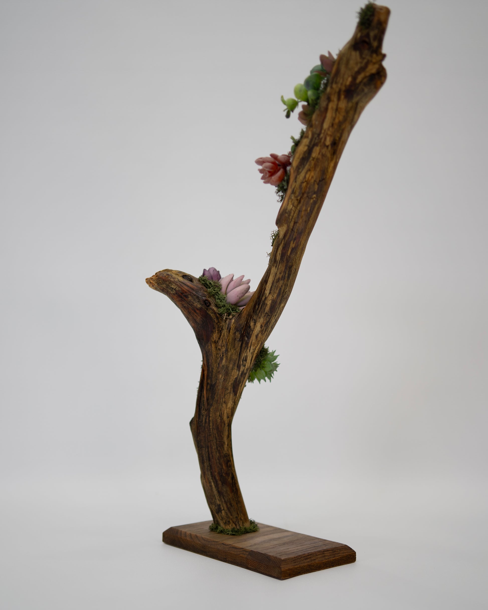 Elevate blends natural driftwood with realistic faux succulents and moss, designed to draw the eye upward and add effortless character to modern spaces.