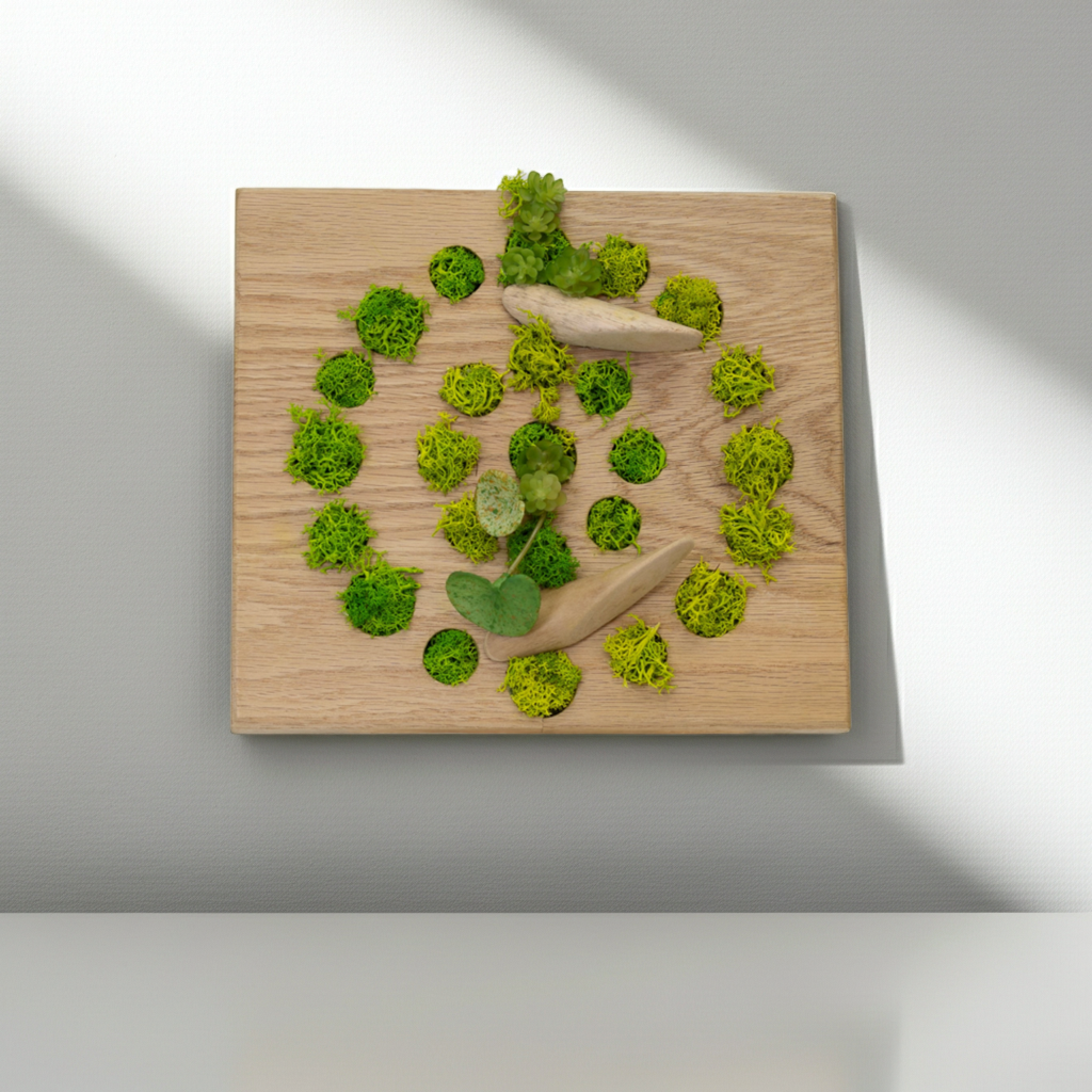Green Tide captures the quiet rhythm of nature in motion. Preserved moss and lifelike greenery flow in a circular current around smooth driftwood, evoking the gentle pulse of earth and water. Crafted on natural oak, this piece bridges modern minimalism with organic design — a living reminder of calm and renewal in any space.
